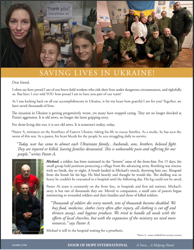 Thousands of soldiers die every month, tens of thousands become disabled. We buy food, medicine, clothes, and hygiene products. With the expansion of the ministry due to increased casualties, we are constantly in desperate need of more supplies. —Pastor A., Eastern Donbas