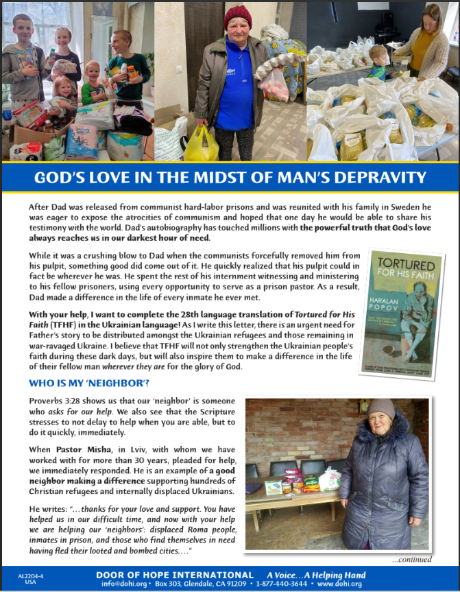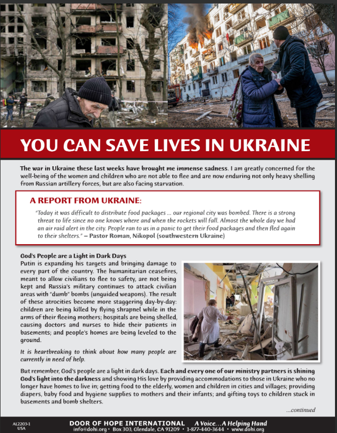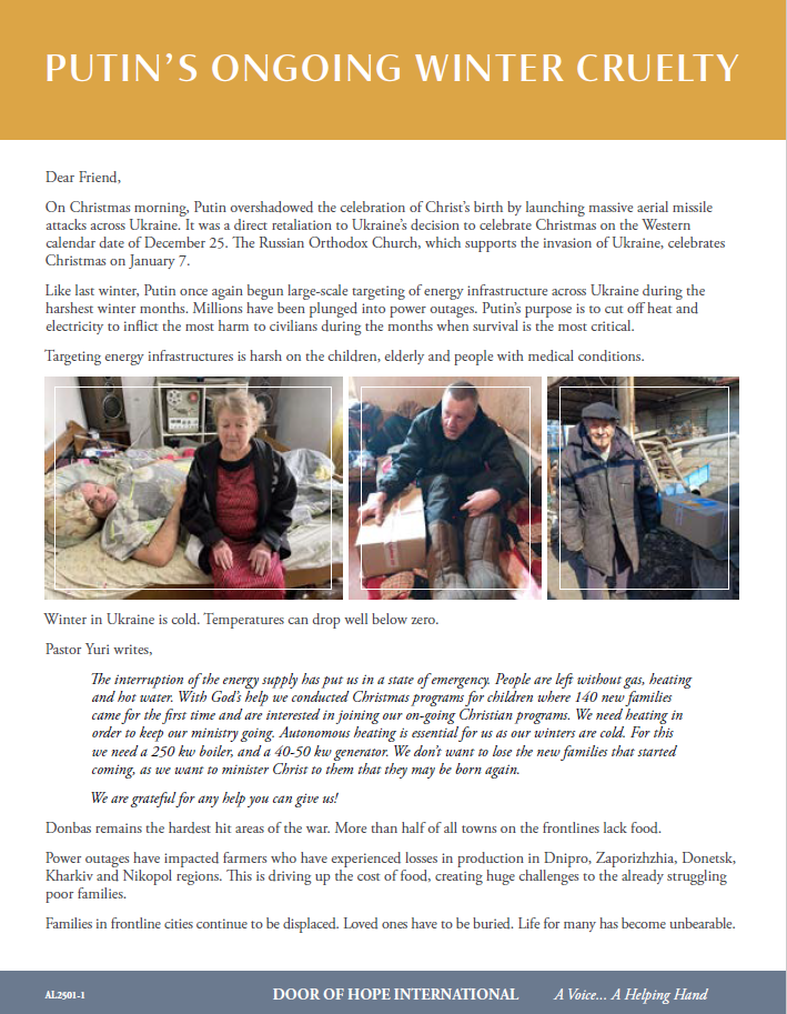 In some of the worst-hit regions of Ukraine, our partners bring food to families and the elderly, transport people to safety during air raids, provide spiritual and physical care to the suffering, and supply desperate families with heating fuel, generators and small portable cooking units that can be used in homes, churches and bomb shelters.