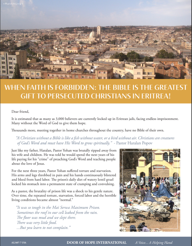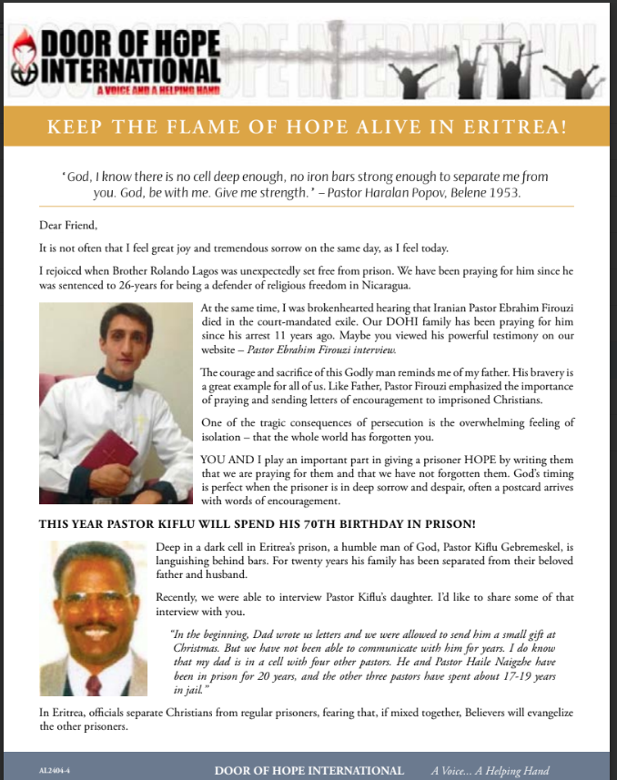 Since 2009, Door of Hope International has been bringing awareness of atrocities and aid to imprisoned Christians and their families in Eritrea.