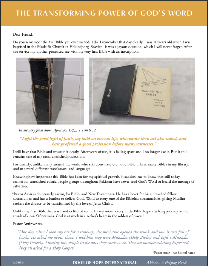 Our goal is to deliver Bibles and New Testaments throughout Pakistan, to reach the unreached, the lost and the spiritually hungry. Many Muslims have lost hope in Islam and are seeking for truth. Praise God, He is preparing hearts to accept His Word.