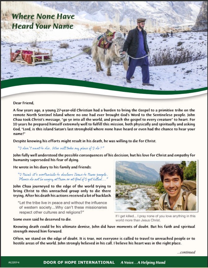 “Reaching the unreached” involves sharing the message of Jesus Christ with those who have never heard it. This includes people who don’t have Bibles or a local Christian community to teach them.